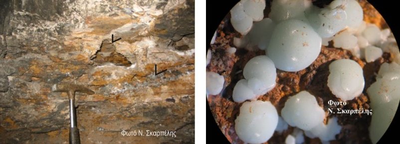 Καλαμίνα (κυρίως σμιθσονίτης) σε έγκοιλο και σε ζώνη διάρρηξης των μαρμάρων (αριστερά)