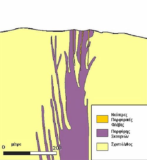 Στο σχήμα στα δεξιά παρουσιάζεται μία τομή του κοιτάσματος των Σκουριών.